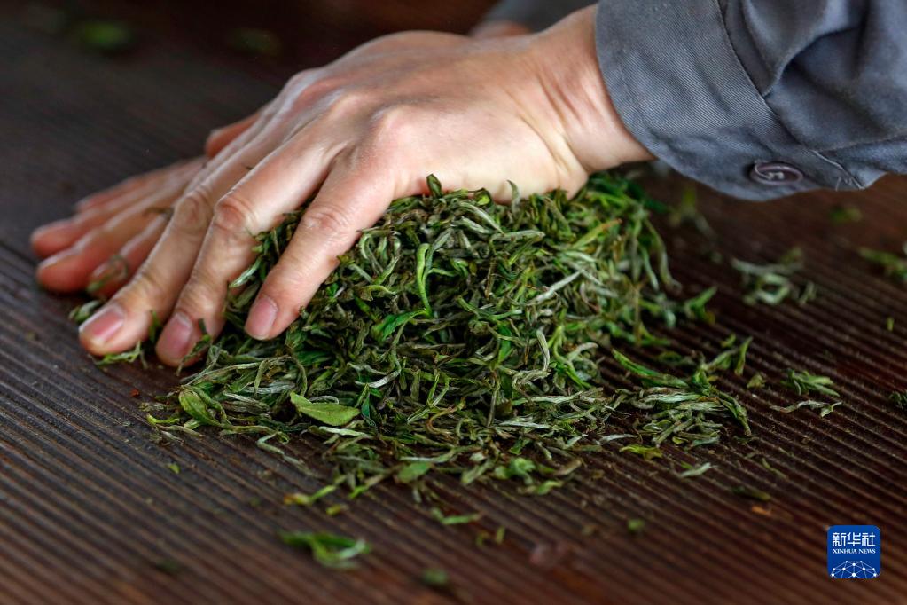 3月28日,祁門(mén)紅茶發(fā)展有限公司工人在揉捻萎凋后的茶葉。