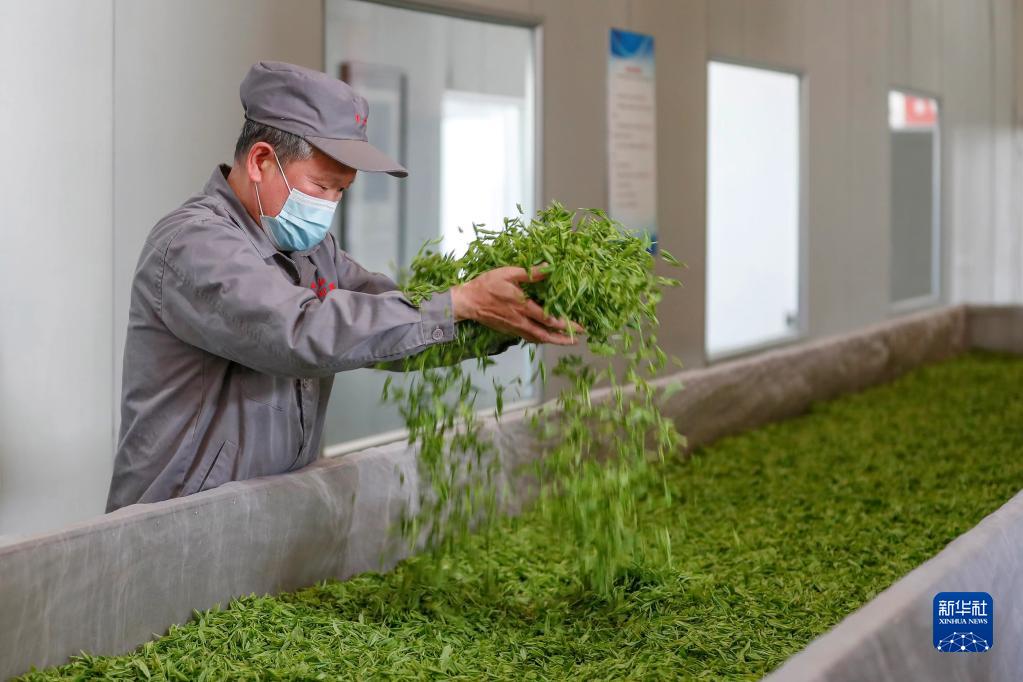 3月28日,祁門(mén)紅茶發(fā)展有限公司的工人在將采摘的鮮葉攤放入萎凋機。