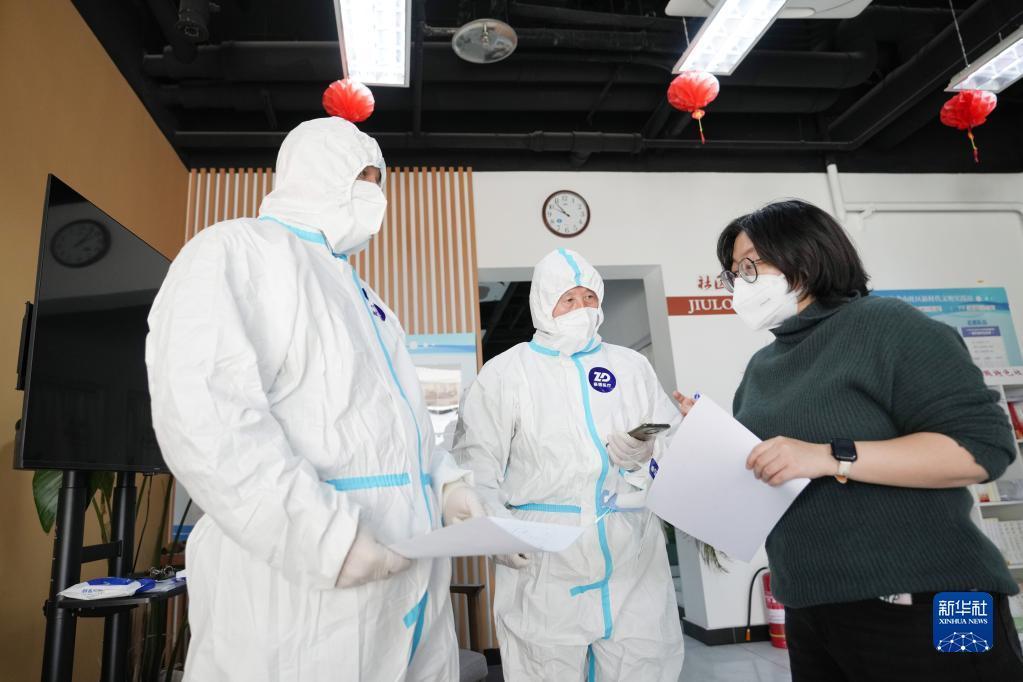 在北京市朝陽(yáng)區雙井街道九龍山社區,社區工作人員(右)向兩位駕駛員講解居民的就醫需求(11月30日攝)。