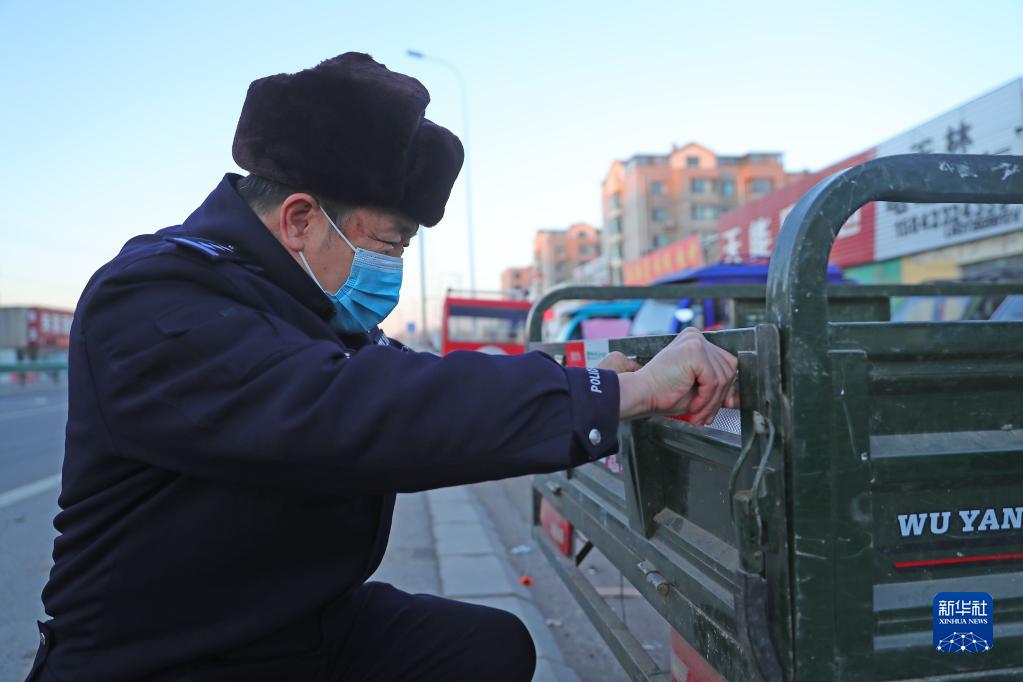 12月1日,沈陽(yáng)市公安局交通警察局蘇家屯大隊交警給農用三輪車(chē)粘貼反光條。