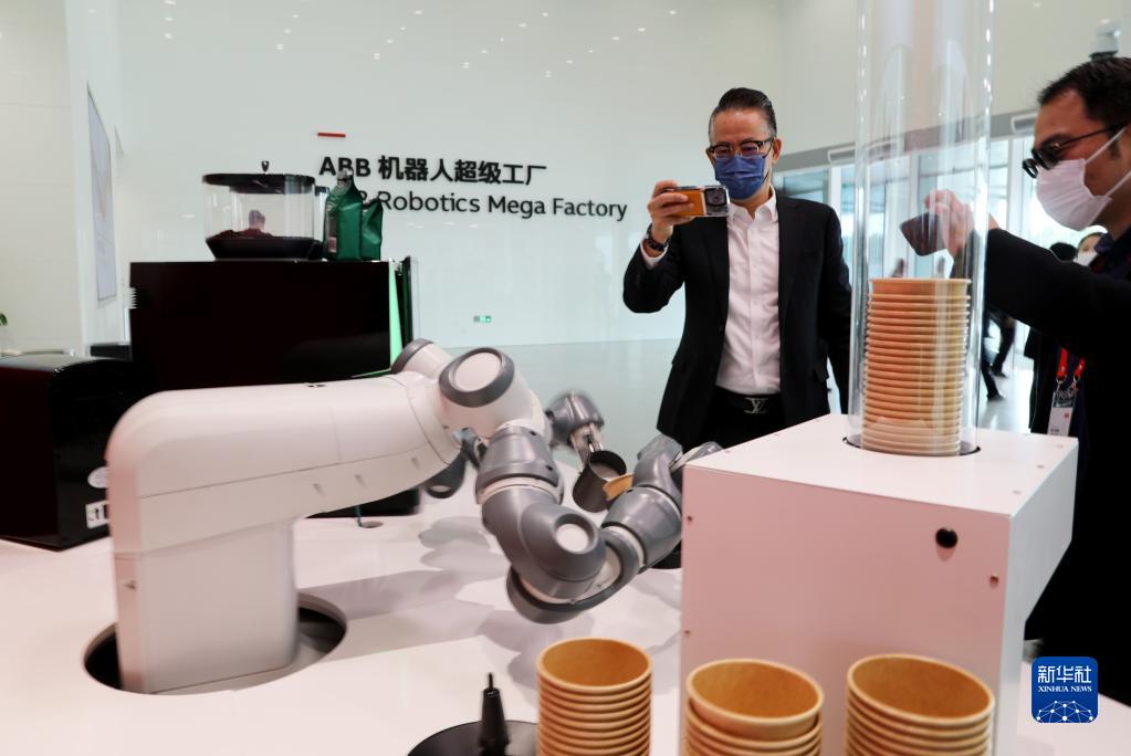 12月2日,機器人在工廠(chǎng)接待大廳內為參加投產(chǎn)儀式的嘉賓制作咖啡。