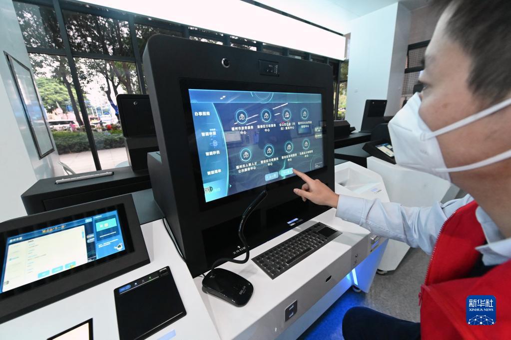 12月1日,志愿者在福州市政務(wù)服務(wù)中心介紹該市創(chuàng )新推出的首批智能“秒報”事項服務(wù)的“榕e辦”智能終端的情況。