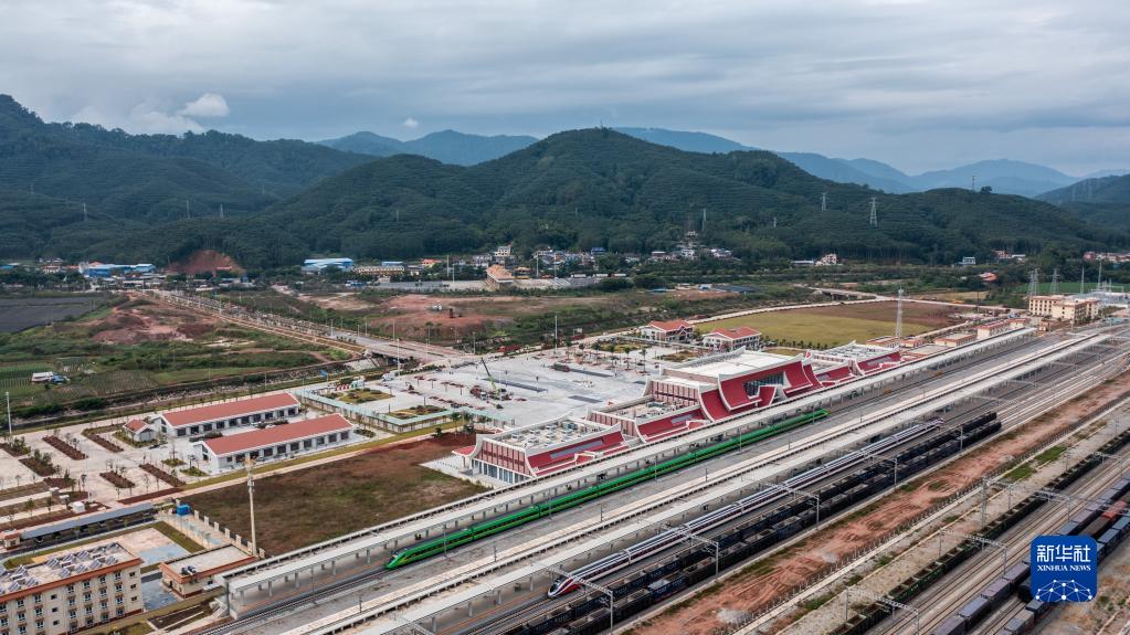 11月24日,“復興號”“瀾滄號”動(dòng)車(chē)組??吭谥欣翔F路磨憨站(無(wú)人機照片)。