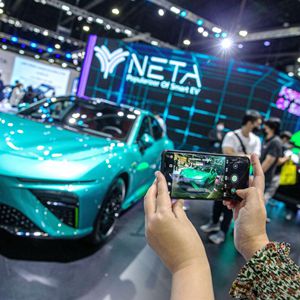 12月1日,觀(guān)眾在曼谷舉行的第39屆泰國國際車(chē)展哪吒汽車(chē)展臺拍攝。