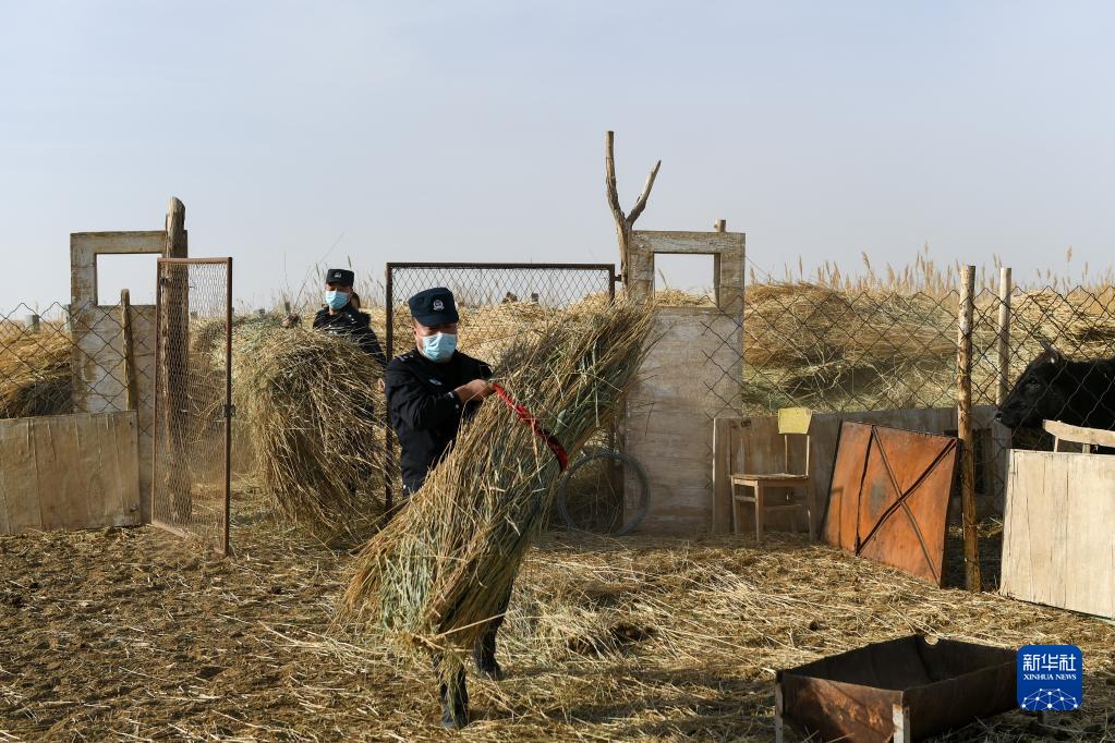 12月2日,溫圖高勒邊境派出所民警為溫圖高勒蘇木牧民搬運牧草。