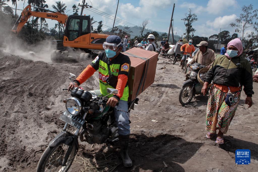 12月6日,在印度尼西亞?wèn)|爪哇省盧馬姜縣松伯武盧村,人們攜帶物品撤離受火山噴發(fā)影響的區域。