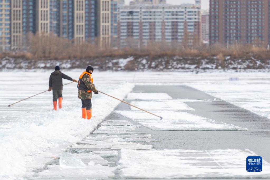 12月6日,工人在松花江哈爾濱段封凍的江面上采冰。