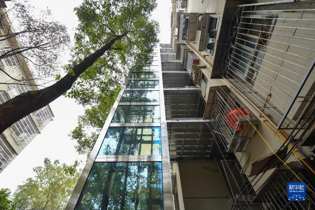 12月7日拍攝的長(cháng)沙市天心區裕南街街道長(cháng)坡社區木材廠(chǎng)宿舍一部待完工的外掛式電梯。