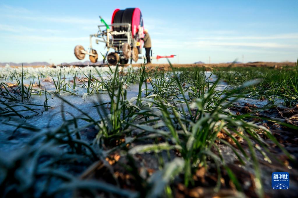 12月7日,河北省遵化市東新莊鎮農民開(kāi)動(dòng)噴灌機澆小麥封凍水。
