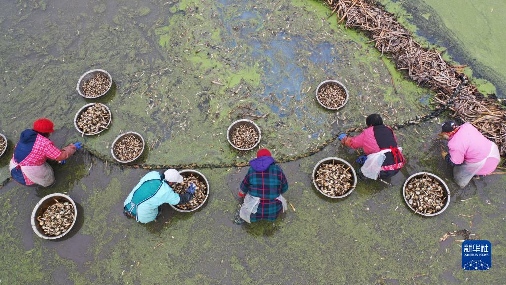 12月7日,農民在江蘇省揚州市邗江區凍青村田里采收茨菇(無(wú)人機照片)。