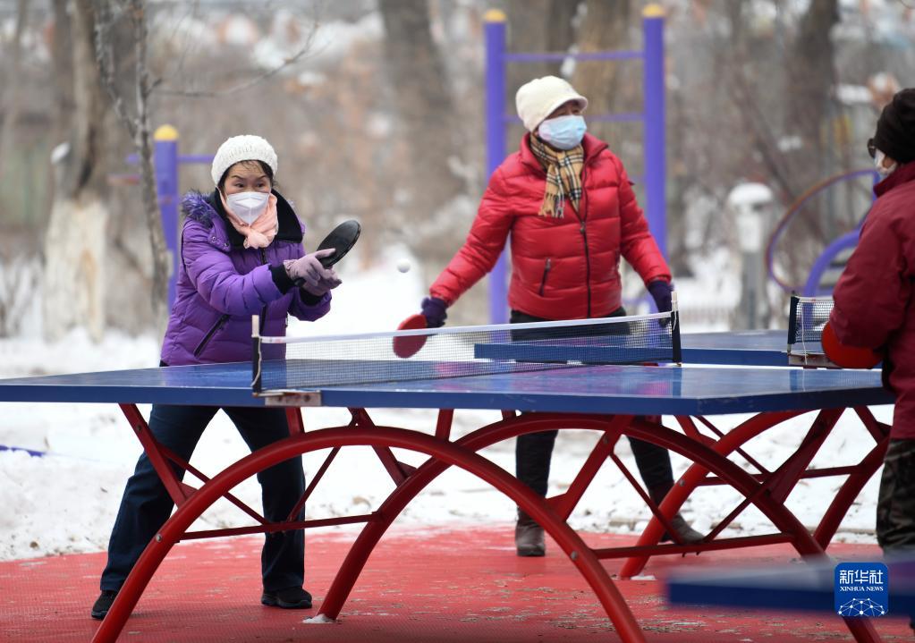 12月7日,在烏魯木齊人民公園內,市民在打乒乓球。