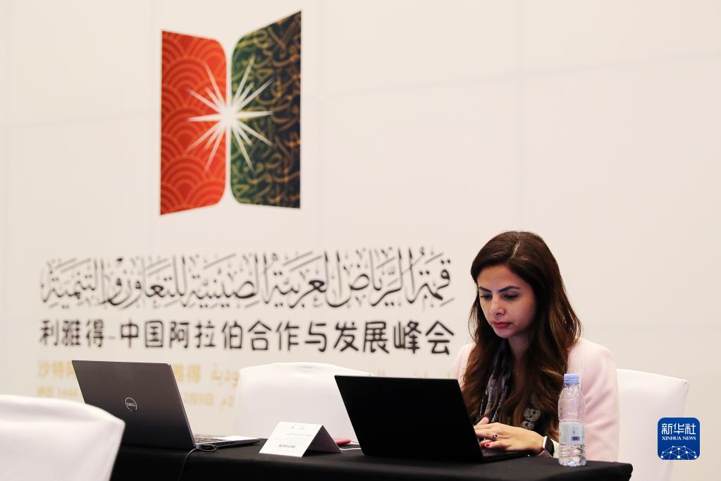 12月7日,在沙特阿拉伯首都利雅得,一名媒體記者在新聞中心工作。