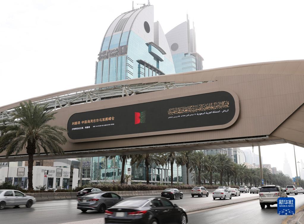 這是12月7日在沙特阿拉伯首都利雅得街頭拍攝的關(guān)于“中國-海灣阿拉伯國家合作委員會(huì )峰會(huì )”的宣傳屏。
