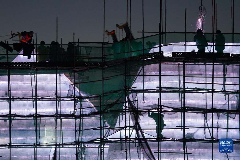 12月7日,施工人員在哈爾濱冰雪大世界園區施工作業(yè)。