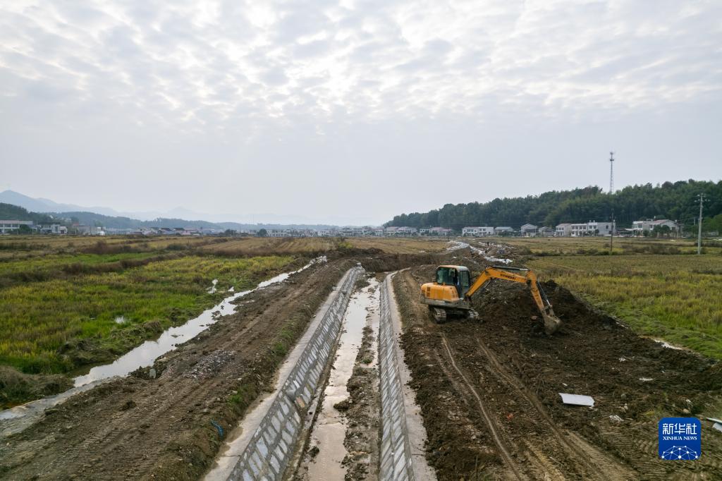 12月8日,工作人員在長(cháng)沙縣金井鎮龍華水庫泄洪河道治理工程項目建設現場(chǎng)施工(無(wú)人機照片)。