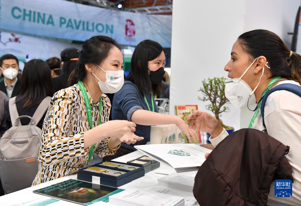 12月7日,一名與會(huì )者在加拿大蒙特利爾《生物多樣性公約》第十五次締約方大會(huì )(COP15)第二階段會(huì )議中國角與工作人員交談。