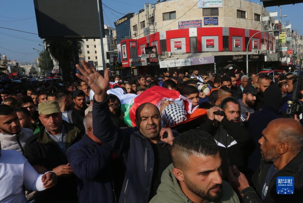 12月8日,在約旦河西岸北部城市杰寧,人們?yōu)楸灰陨熊婈牬蛩赖陌屠账固谷怂驮帷?/p>