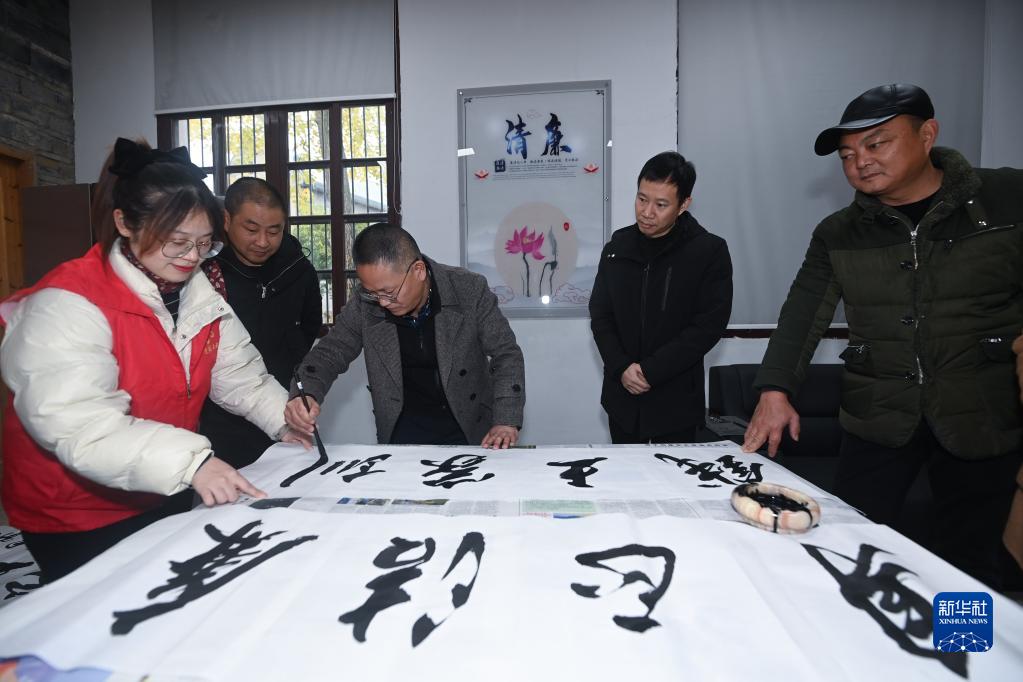 12月9日,杭州市臨安區太陽(yáng)鎮上莊村村民在觀(guān)看書(shū)法愛(ài)好者現場(chǎng)書(shū)寫(xiě)以“廉潔家風(fēng)”為主題的書(shū)法作品。