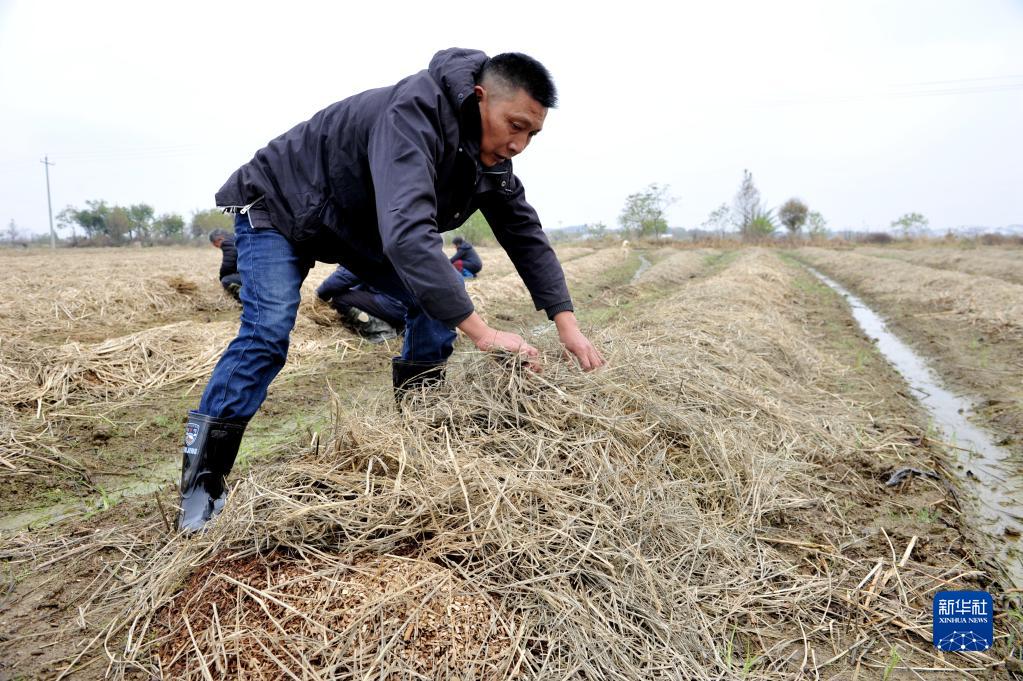 在江西省南昌市南昌縣幽蘭鎮,村民們在收割后的晚稻田里利用處理過(guò)的秸稈種植大球蓋菇(12月7日攝)。