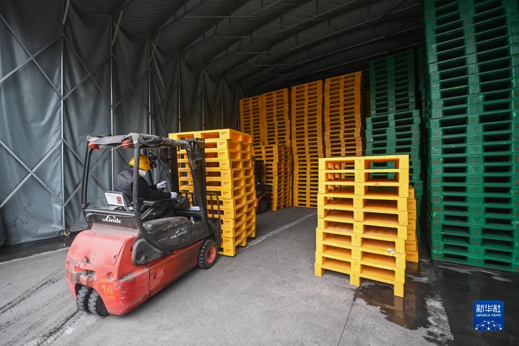 12月9日,在位于杭州市臨安區的杭州福斯特應用材料股份有限公司,工人把新制造出來(lái)的塑料托盤(pán)運送到倉庫。該企業(yè)通過(guò)自主研發(fā),將企業(yè)內部產(chǎn)生的一般塑料固廢和廢塑料桶制作成塑料托盤(pán),降低了固體廢料的排放。新華社記者 徐昱 攝
