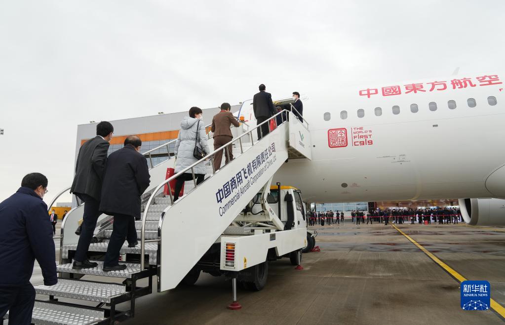12月9日,國產(chǎn)大飛機C919準備從上海浦東飛往虹橋完成“首秀”飛行,乘客有序登機。
