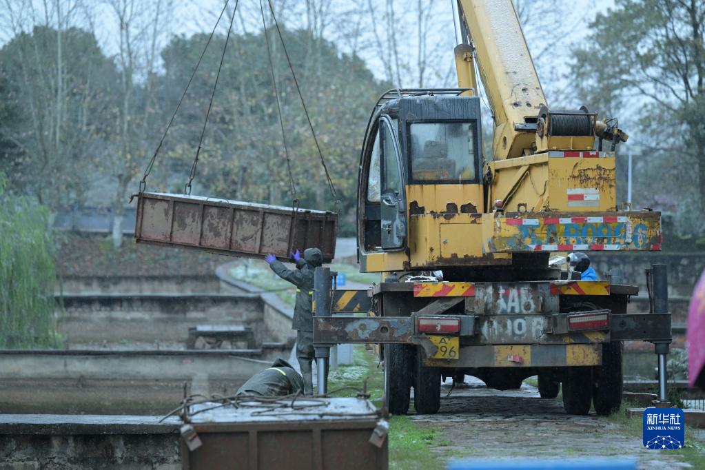 11月30日,在安徽揚子鱷國家級自然保護區夏渡片區,工作人員用吊車(chē)將人工繁育的揚子鱷裝箱轉移到越冬暖房。