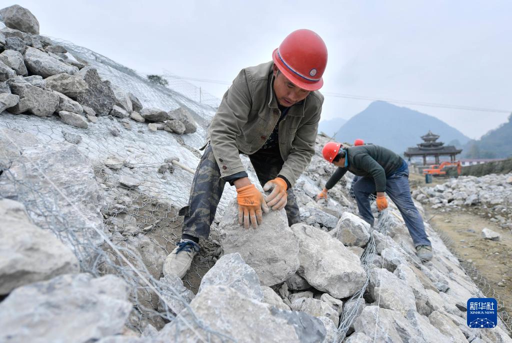12月9日,工人在湖北省宣恩縣椒園鎮水田壩村修建河堤。