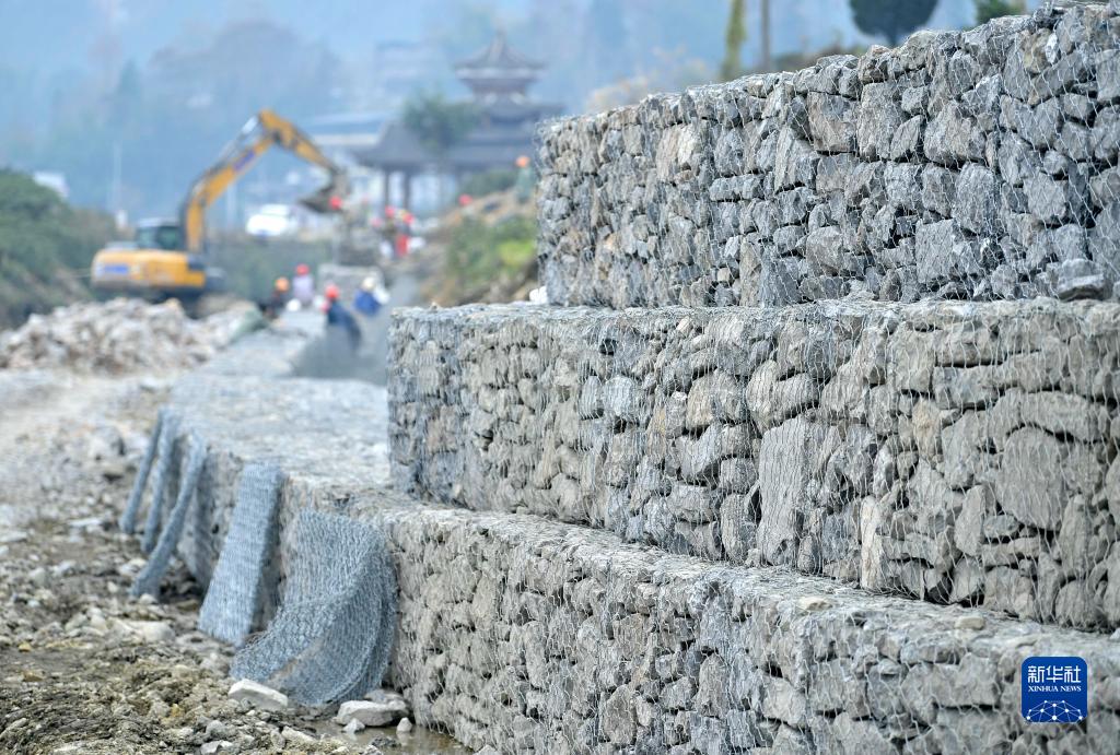 12月9日,工人在湖北省宣恩縣椒園鎮水田壩村修建河堤。
