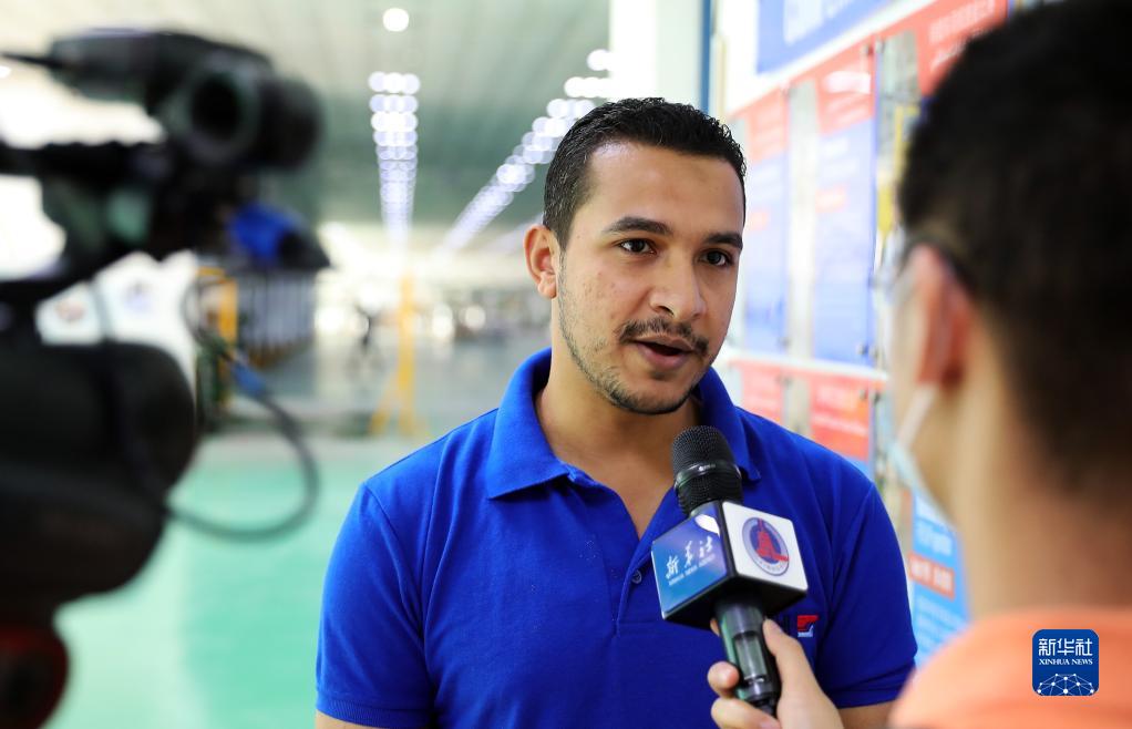 9月7日,在埃及蘇伊士省蘇赫奈泉港,中國巨石埃及玻璃纖維股份有限公司(巨石埃及)員工艾哈邁德·蘇萊曼接受新華社記者采訪(fǎng)。