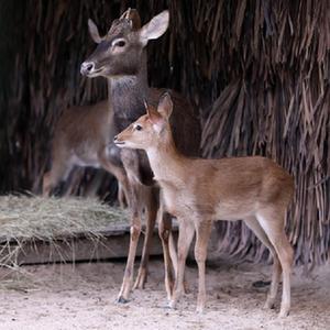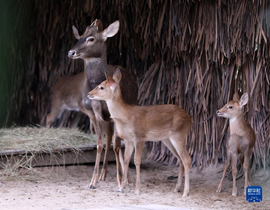 當日,廣州長(cháng)隆野生動(dòng)物世界成功繁育的兩頭國家一級保護動(dòng)物海南坡鹿與游客見(jiàn)面。這兩頭海南坡鹿幼崽分別出生于2022年10月4日和22日,均為雄性。