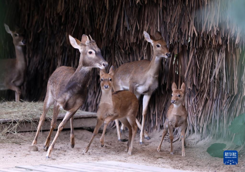 當日,廣州長(cháng)隆野生動(dòng)物世界成功繁育的兩頭國家一級保護動(dòng)物海南坡鹿與游客見(jiàn)面。這兩頭海南坡鹿幼崽分別出生于2022年10月4日和22日,均為雄性。