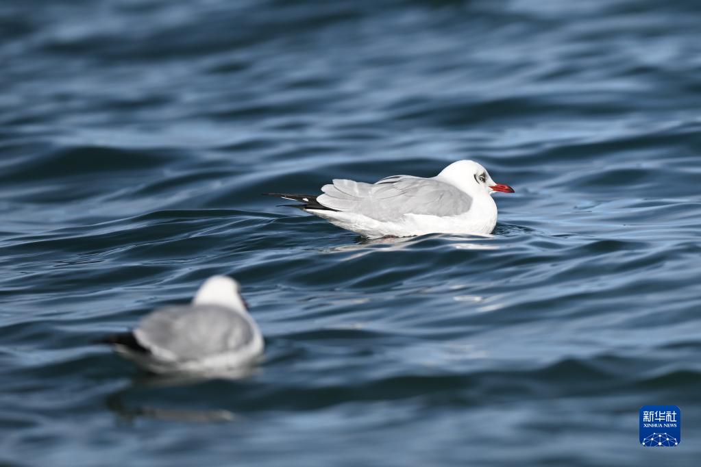 12月9日,兩只棕頭鷗在青海湖游弋。