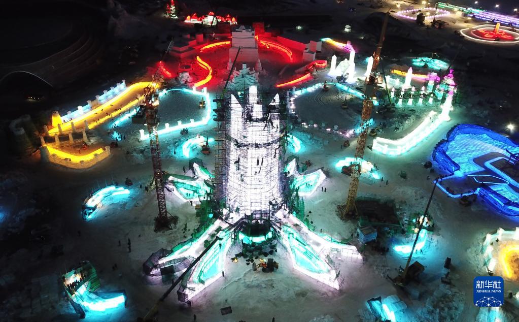 12月9日,哈爾濱冰雪大世界園區主塔“冰雪之冠”在進(jìn)行燈光調試(無(wú)人機照片)。