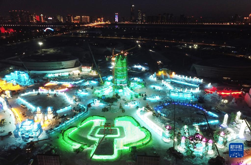 施工建設中的哈爾濱冰雪大世界園區主塔“冰雪之冠”(12月8日攝,無(wú)人機照片)。