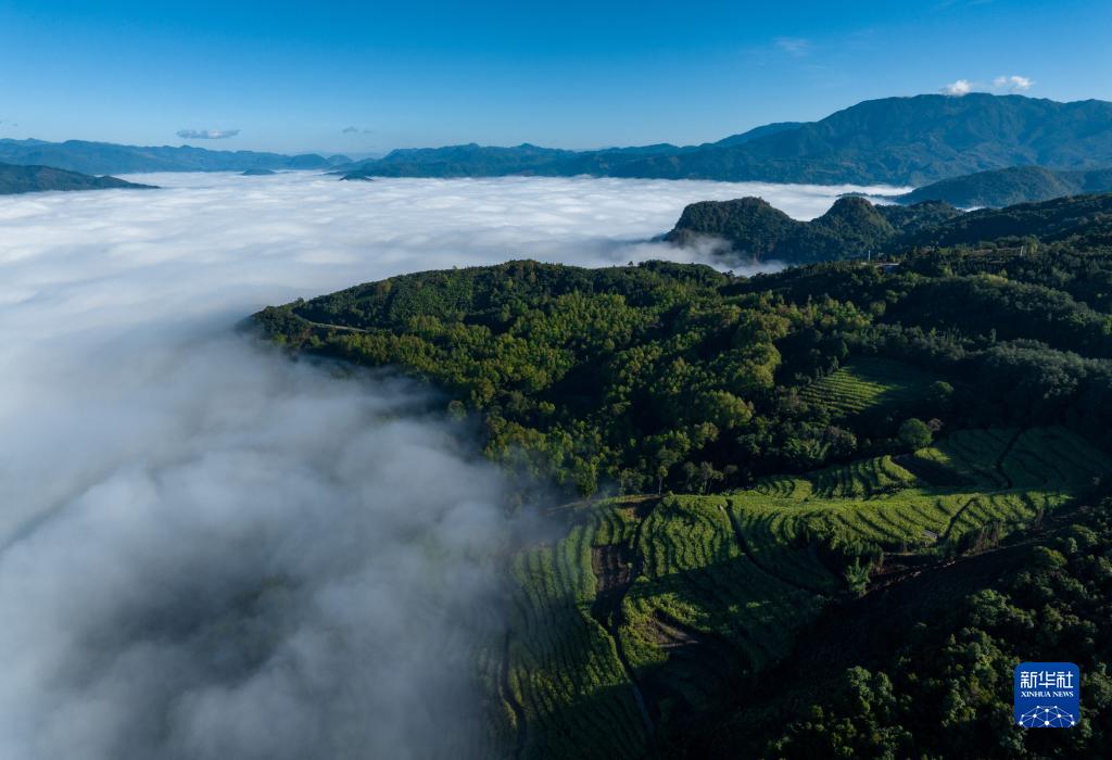 這是在云南省臨滄市滄源佤族自治縣拍攝的云海間的茶園(12月9日攝,無(wú)人機照片)。