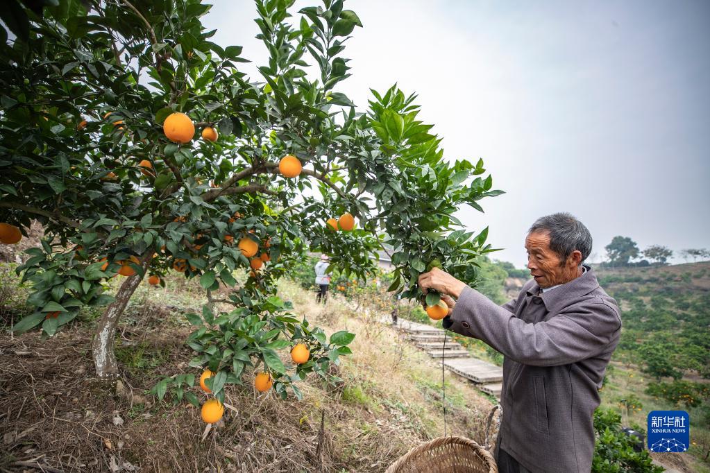 12月9日,在重慶市璧山區廣普鎮坪中村,村民在果園內采摘臍橙。