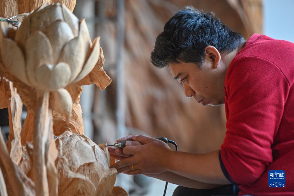 12月9日,陳志華的學(xué)徒陳歡在莆田市秀嶼區根藝博物館內給已初步成型的木雕修光。