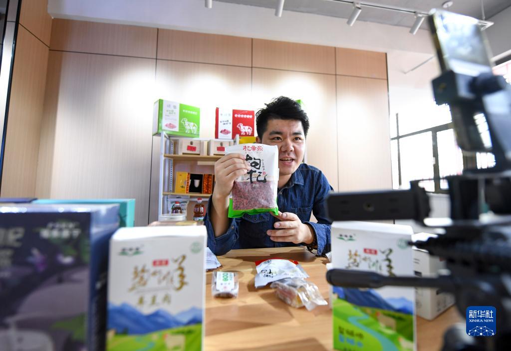 12月9日,電商主播在獅城寧好電商網(wǎng)批(西部)運營(yíng)基地直播銷(xiāo)售寧夏農特產(chǎn)品。