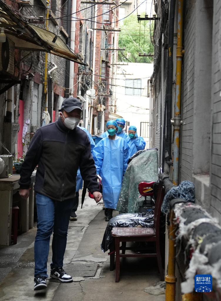 由居委會(huì )干部帶路,接種小分隊成員穿過(guò)位于黃浦區順昌路的弄堂,前往行動(dòng)不便的老人家中接種(12月5日攝)。