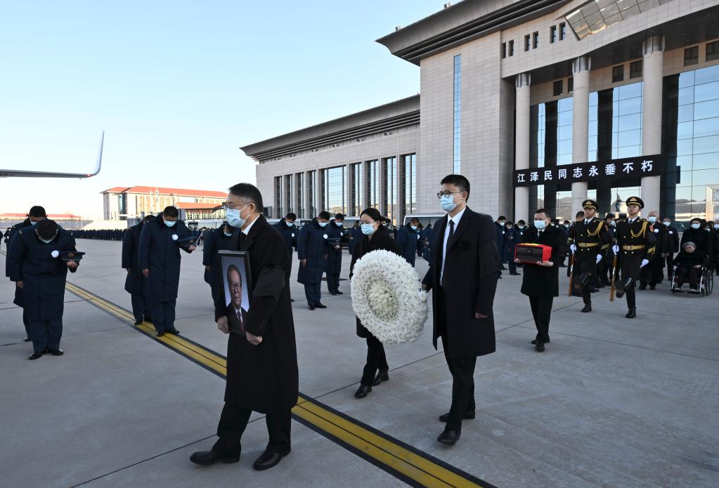 12月11日,遵照江澤民同志及其親屬的意愿,敬愛(ài)的江澤民同志的骨灰在長(cháng)江入??谌鋈氪蠛?。受黨中央委托,中共中央政治局常委、中央書(shū)記處書(shū)記蔡奇等領(lǐng)導同志和江澤民同志的夫人王冶坪等親屬護送骨灰撒放。這是在北京西郊機場(chǎng),江澤民同志的親屬捧著(zhù)遺像、骨灰盒和花圈,緩步走向專(zhuān)機。新華社記者 燕雁 攝