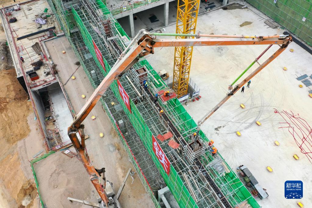 12月12日,工作人員在進(jìn)行混凝土澆筑(無(wú)人機照片)。