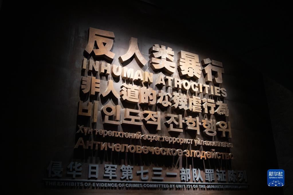 這是侵華日軍第七三一部隊罪證陳列館內用六種語(yǔ)言寫(xiě)的“反人類(lèi)暴行”墻(12月10日攝)。