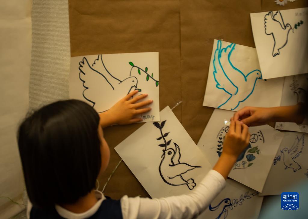 12月11日,一名女孩在美國舊金山參加“南京祭”活動(dòng)時(shí)張貼以和平鴿為主題的繪畫(huà)。
