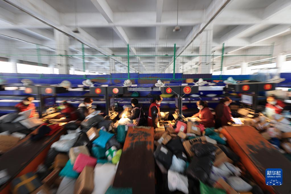 12月12日,在浙江省湖州市吳興區八里店鎮一家物流企業(yè),工作人員分揀快遞。