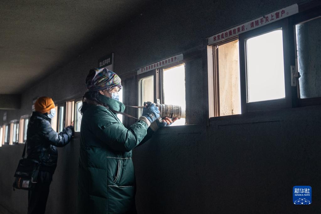 12月10日,觀(guān)鳥(niǎo)愛(ài)好者在云南大山包黑頸鶴國家級自然保護區的地堡里觀(guān)測黑頸鶴。