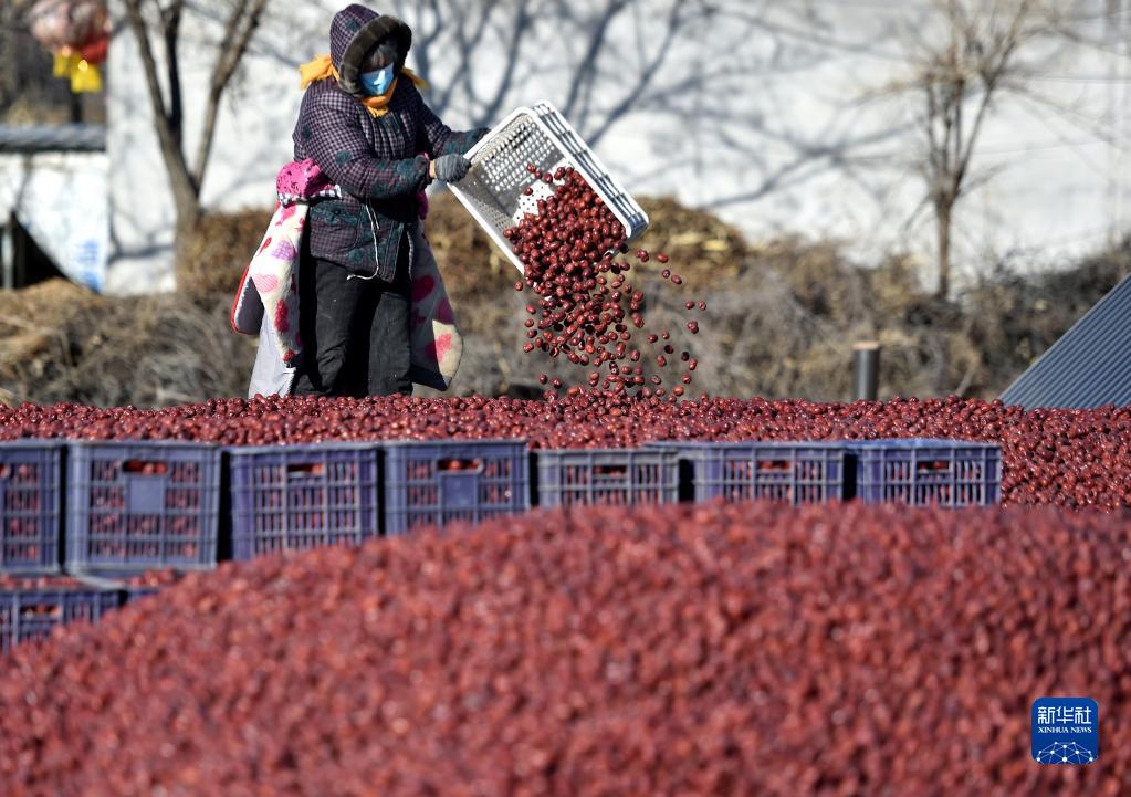 連日來(lái),河北省石家莊市行唐縣大棗種植戶(hù)利用晴好天氣對大棗進(jìn)行晾曬、篩選,供應市場(chǎng)。近年來(lái),行唐縣政府引導當地群眾利用丘陵和淺山區地帶種植優(yōu)質(zhì)大棗樹(shù),促進(jìn)農民增收。