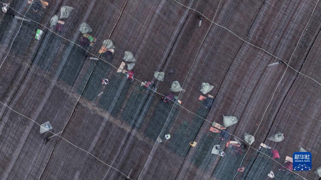 12月13日,村民在丹寨縣興仁鎮茶葉育苗基地扦插茶苗(無(wú)人機照片)。