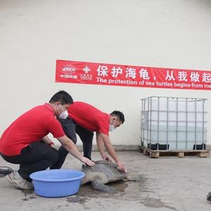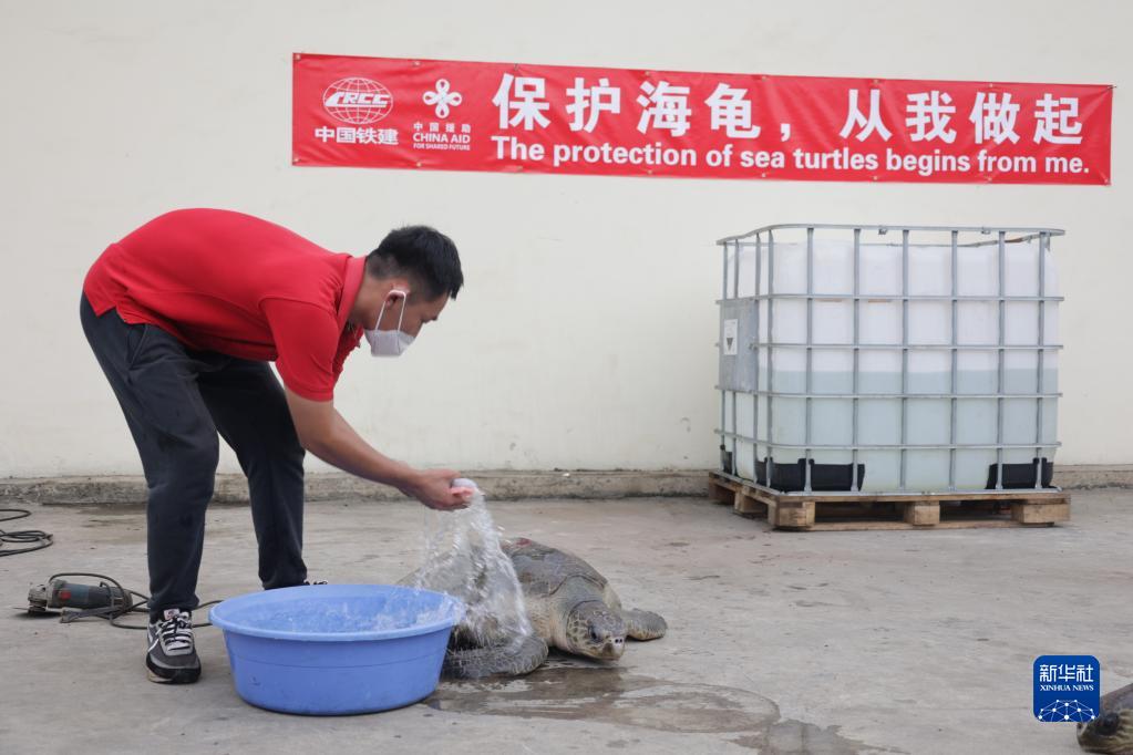 11月4日,工作人員在加納首都阿克拉中國援建加納漁港綜合設施項目施工現場(chǎng)照料需要救助的海龜。