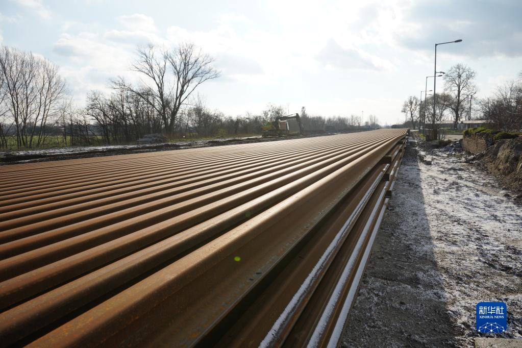 這是12月12日在匈牙利基什孔洛茨哈佐拍攝的匈塞鐵路匈牙利段工地上待鋪裝的新鐵軌。