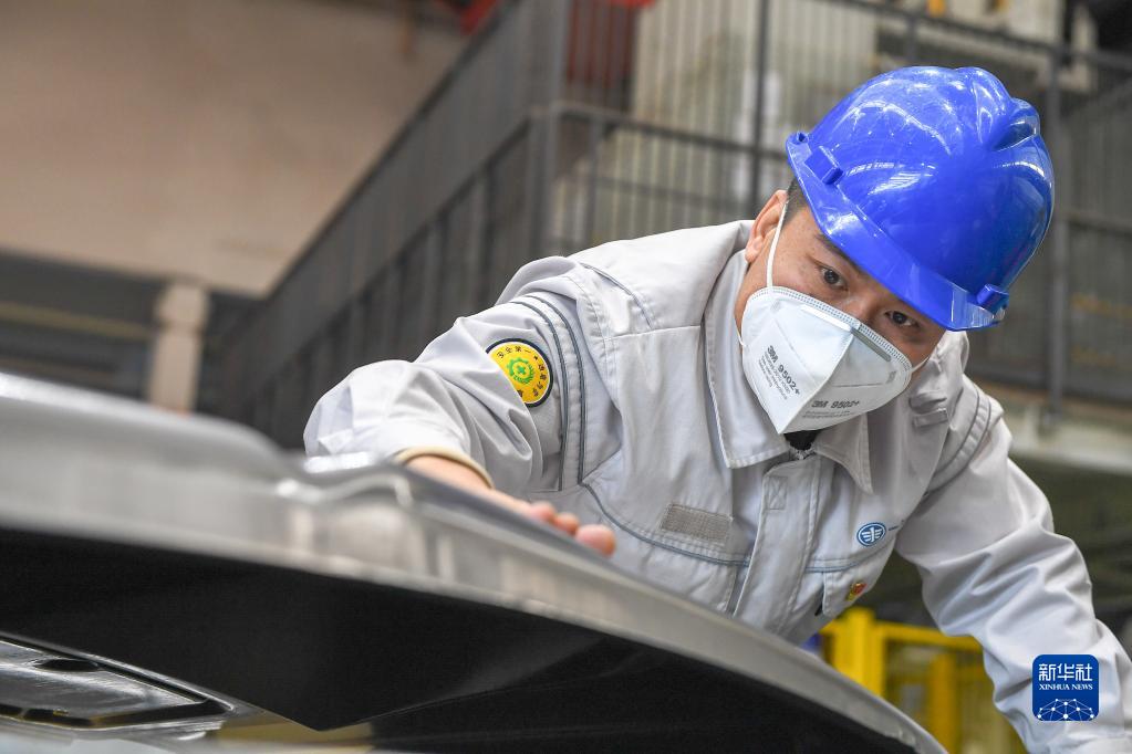 12月14日,在位于長(cháng)春的一汽解放汽車(chē)有限公司卡車(chē)廠(chǎng)沖壓車(chē)間,馮斌檢查零部件細節。